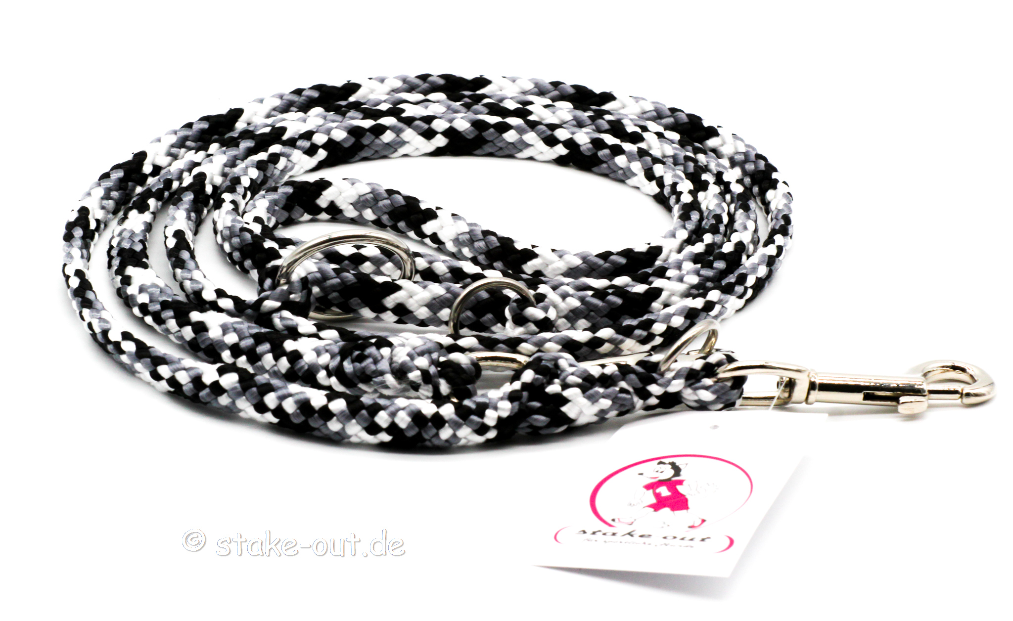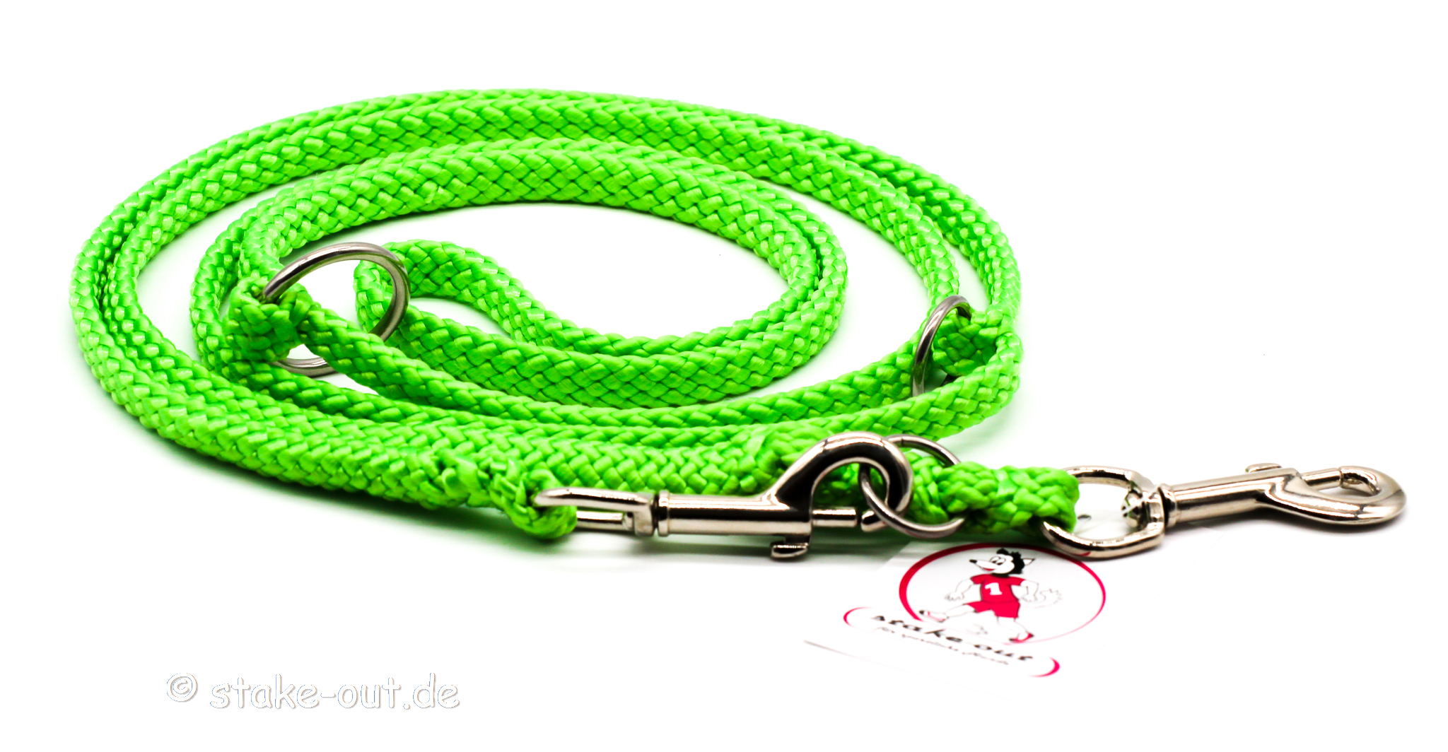 Die Leine besteht aus Polypropylen Hohlseil welches mit einer Spleißnadel im Spleißverfahren gefertigt wird. Spleißen kommt aus der Schifffahrt und ist eine uralte Art Seile zu verbinden. An der Leine wird nichts geklebt, gepresst oder vernäht sondern durch das Spleißen entsteht eine saubere und reißfeste Verbindung.