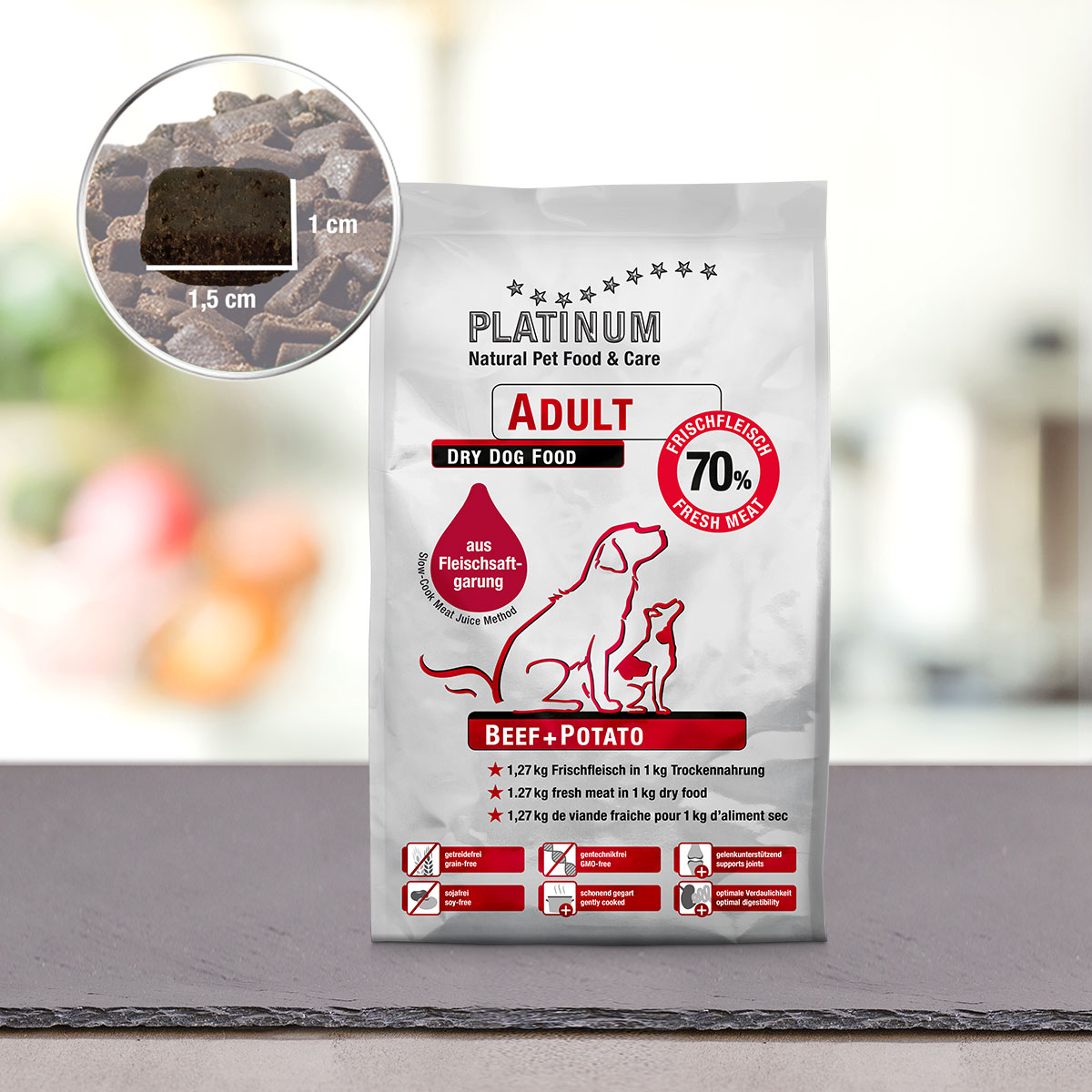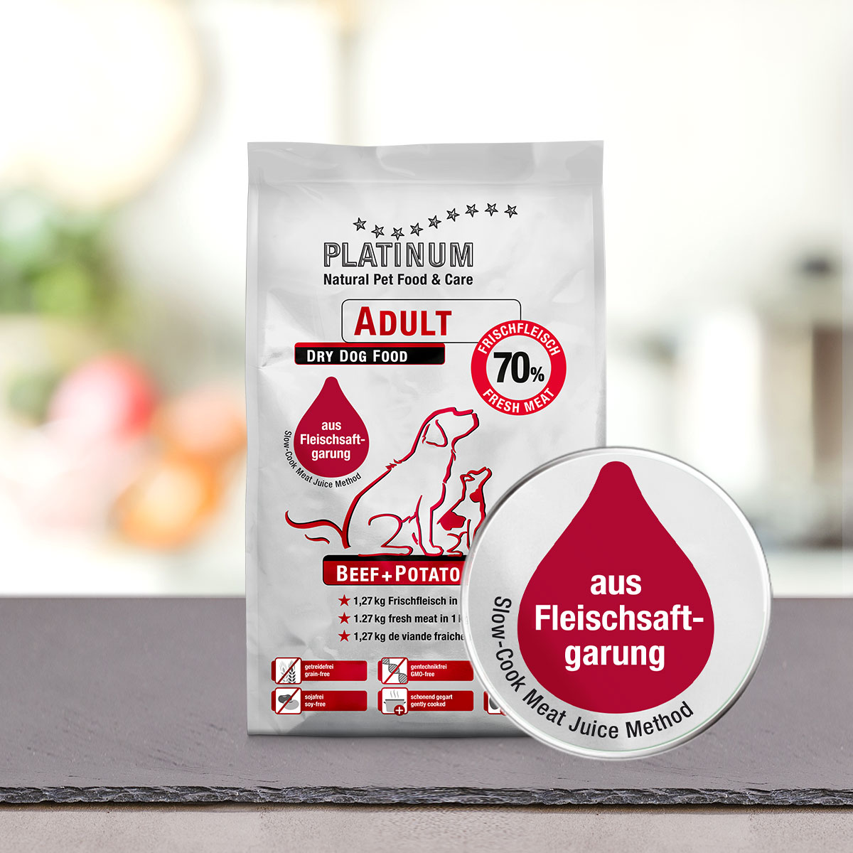 Unsere Trockennahrung Adult Beef+Potato wird durch Fleischsaftgarung zubereitet. Fleischsaftgarung ist eine besondere Zubereitungsart von Frischfleisch, die in der Küche entstanden ist, nicht in der Futtermittelindustrie. Vorbild waren Techniken, die Spitzenköche oft verwenden, um Fleisch durch den Fleischsaft schmackhafter und auch gesünder zuzubereiten. Die Fleischsaftgarung ist eine ausgewählte Kombination dieser Zubereitungstechniken, angepasst an die körperlichen Bedürfnisse und Interessen des Hundes.