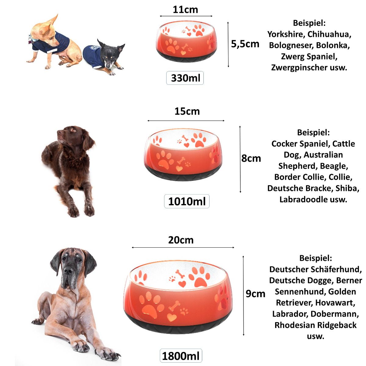 - Den Napf gibt es in 3 verschiedenen Größe. S (330ml – Gewicht: 200g, Durchmesser: 12,3cm), M (1010ml - Gewicht: 640g, Durchmesser: 17,8cm) und L (1800ml - Gewicht: 940g, Durchmesser: 21,6cm). Für jede Hunderasse ist somit ein passender Napf zu finden. Das Volumen ist für kleine, mittlere und große Hunde ideal. Hinweis: Nicht mikrowellengeeignet. Beim Barfen können Verfärbungen entstehen.