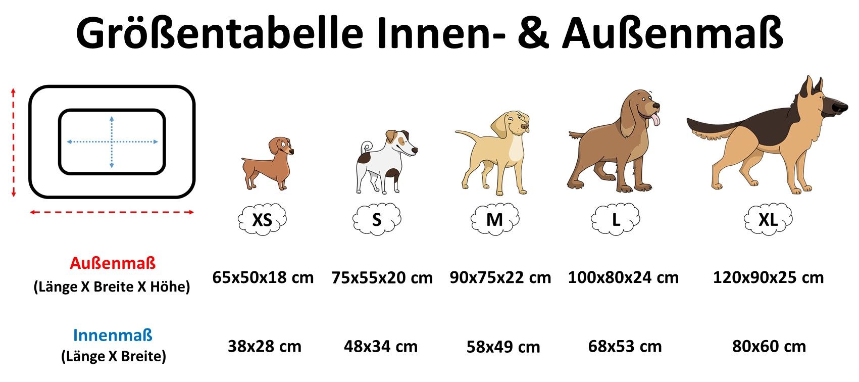 Das Hundebett gibt es in 5 verschieden Größen, von XS bis XL, um allen Hunderassen gerecht zu werden. Außerdem ist das Hundebett in 6 verschiedenen Farben erhältlich. Made in EU